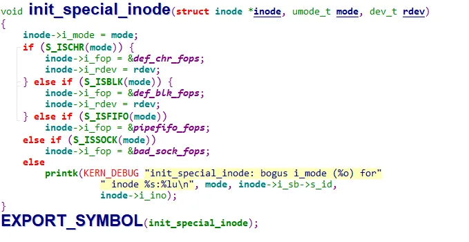 sys_mknod 首先在根文件系统ext3的根目录“/”下寻找 dev 目录所对应的inode,图中对应的inode 编号为168,ext3 文件系统的实现会通过某种映射机制,通过inode 编号最终得到该inode在内存中的实际地址(图中由标号1的线段表示)。接下来会通过dev的inode结构中的i_op成员指针所指向的ext3_dir_inode_operations(这是个 struct inode_operations类型的指针),来调用该对象中的mknod方法,这将导致ext3mknod 函数被调用。ext3 mknod 函数的主要作用是生成一个新的inode(用来在内核空间表示 demodev 设备文件节点,demodev设备节点文件与新生成的inode 之间的关联在上图中由标号5的线段表示)。在 ext3 mknod 中会调用一个和设备驱动程序关系密切的init_special_inode 函数,其定义如下:这个函数最主要的功能便是为新生成的inode 初始化其中的i_fop和i_rdev成员。设备文件节点inode 中的i_rdev成员用来表示该inode 所对应设备的设备号,通过参数 rdev 为其赋值。设备号在由sysmknod发起的整个内核调用链中进行传递,最早来自于用户空间的mknod 命令行参数。i_fop成员的初始化根据是字符设备还是块设备而有不同的赋值。对于字符设备,fop指向def_chr_fops,后者主要定义了一个 open 操作:/* * Dummy default file-operations: the only thing this does * is contain the open that then fills in the correct operations * depending on the special file... */const struct file_operations def_chr_fops = { .open = chrdev_open, .llseek = noop_llseek,};