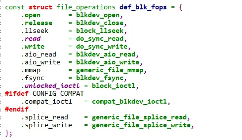 相对于字符设备,块设备的def_blk_fops的定义则要有点复杂: