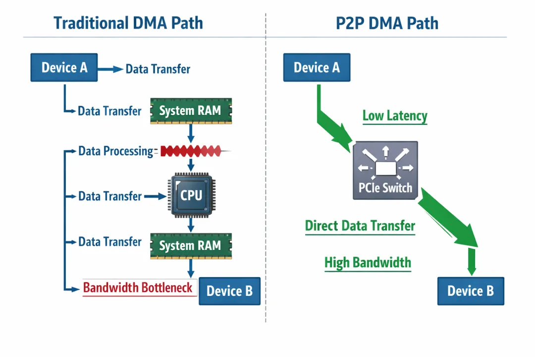 PCIe Peer-to-Peer (P2P) DMA 技术通过允许 PCIe 设备间直接进行数据传输,彻底改变了传统的数据传输模式。在 P2P DMA 架构中,数据可以直接从一个设备的内存空间传输到另一个设备的内存空间,完全绕过系统内存和 CPU 的参与。