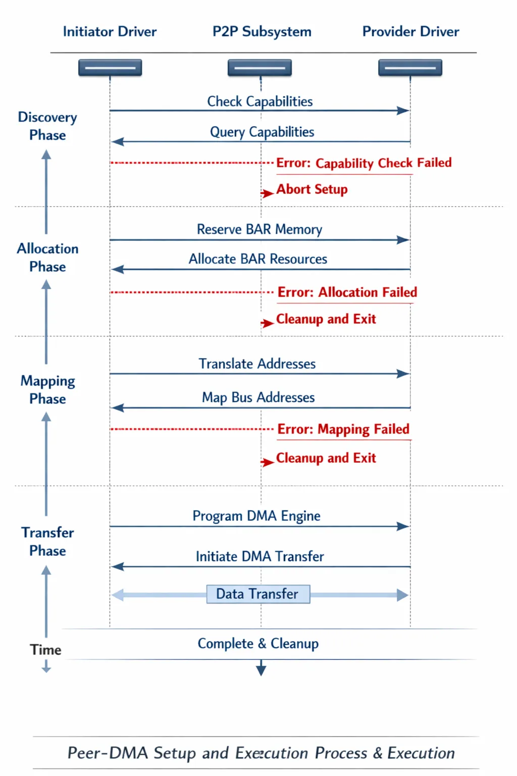 传输阶段是 P2P DMA 的执行环节,由发起者设备的 DMA 引擎直接访问提供者设备的内存地址。