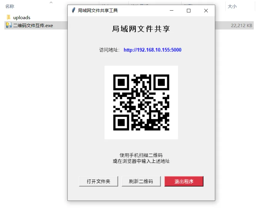 程序功能自动获取本机IP地址:程序会自动检测局域网IP地址,无需手动配置启动Web服务:在5000端口启动Flask服务器,支持文件上传和下载生成二维码:自动创建包含访问URL的二维码,方便手机扫码访问GUI界面:显示二维码、访问地址和操作按钮
