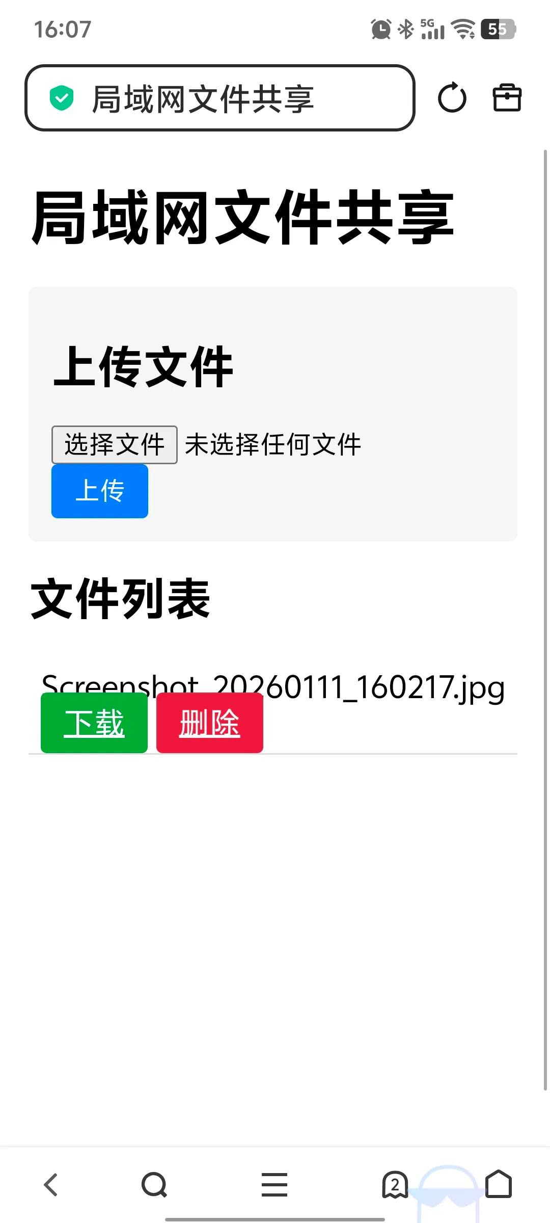 手机扫描二维码后,可以在手机浏览器中上传下载删除文件