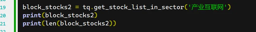 block_stocks2 = tq.get_stock_list_in_sector('产业互联网')print(block_stocks2)print(len(block_stocks2))