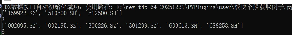#获取自定义某个板块。要求输入“自定义板块简称”block_stocks3 = tq.get_stock_list_in_sector('CS',block_type=1)print(block_stocks3)print(len(block_stocks3))