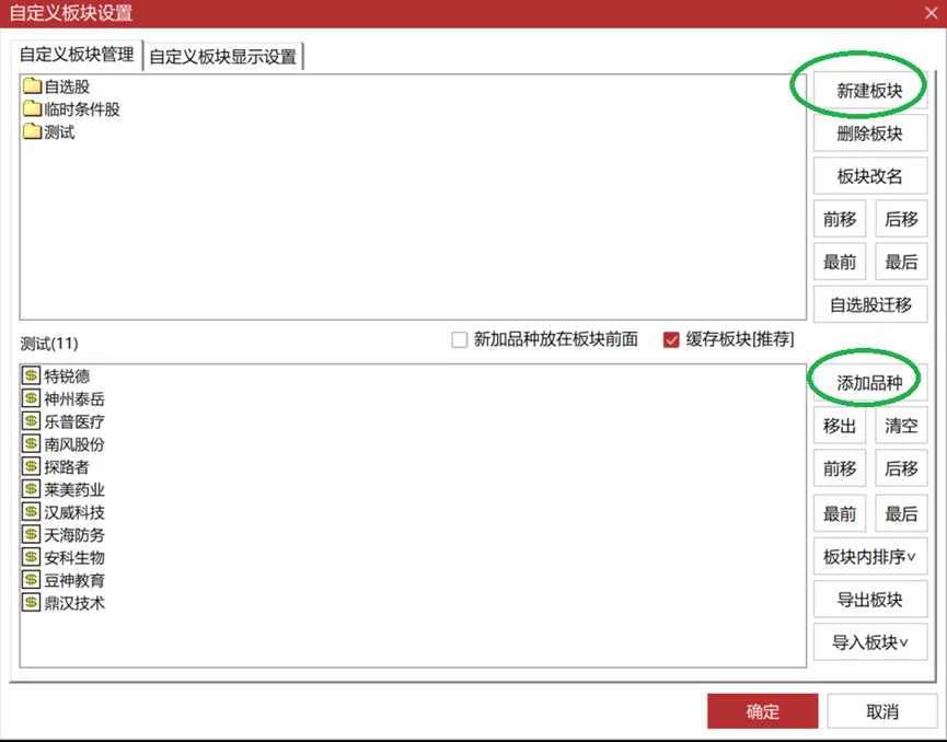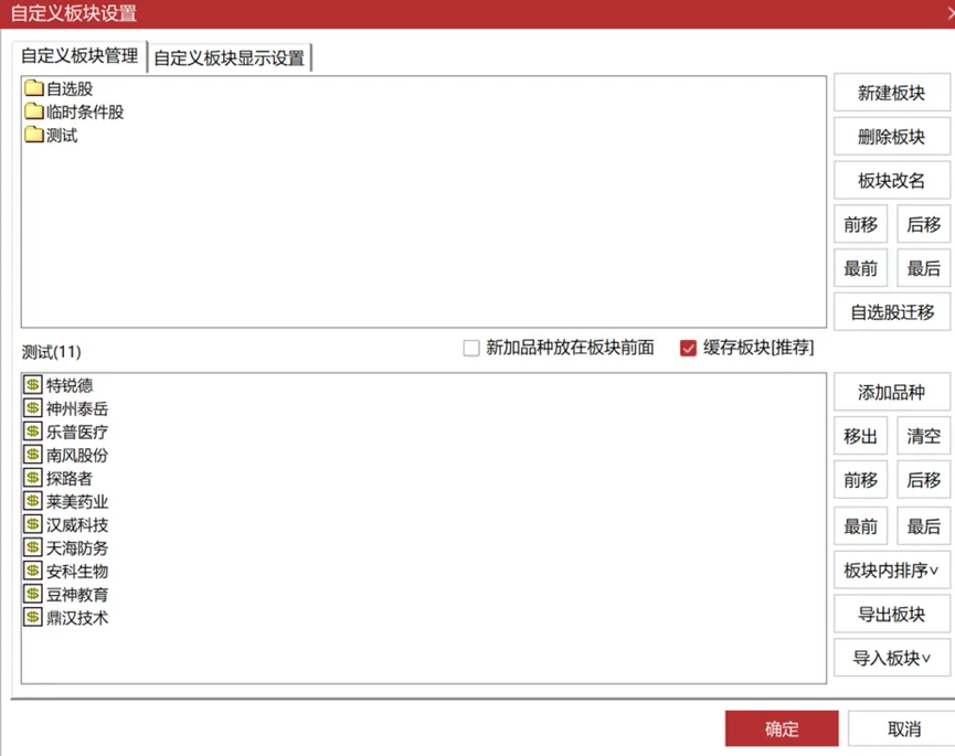 这是通过“自定义板块设置”,“新建板块”,“添加品种”得到的: