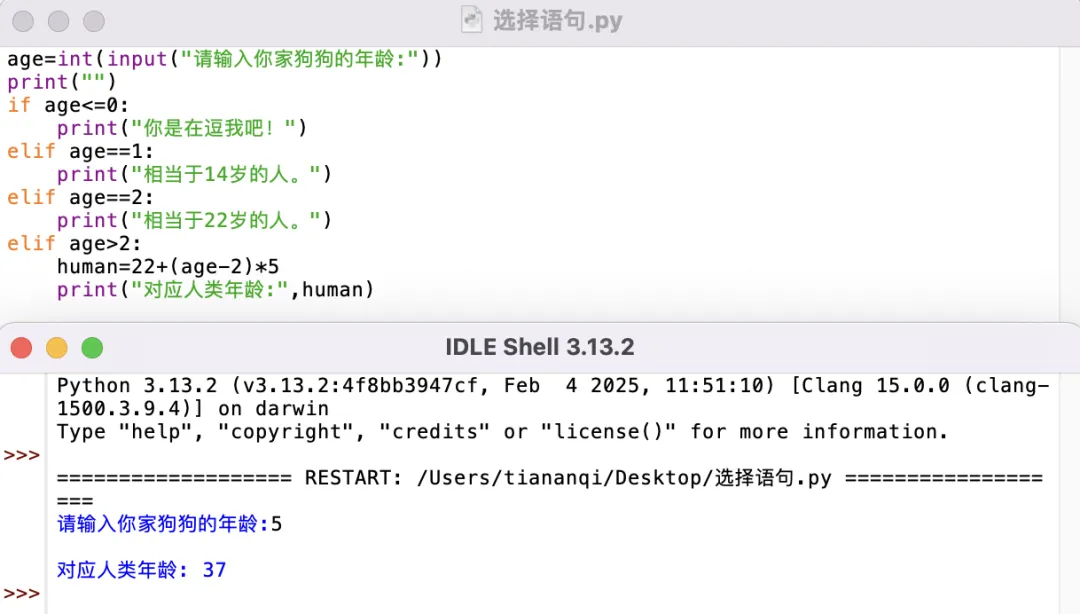 (1)print(“”)代表在“请输入你家狗狗的年龄:”后隔一行,效果同print()