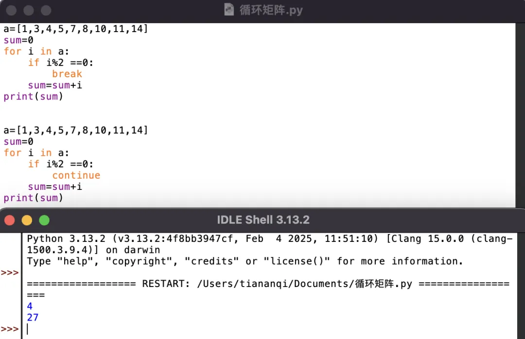 break碰到第一个偶数就不加了;continue实现“求序列中的奇数之和”