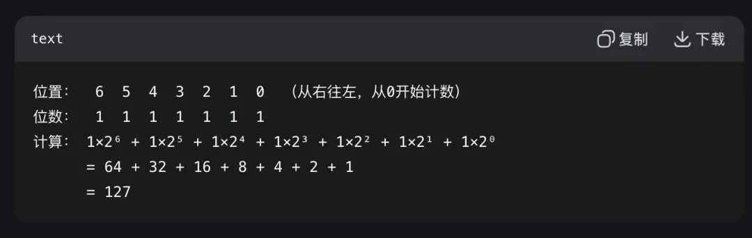 二进制:1111111,转换成十进制:127