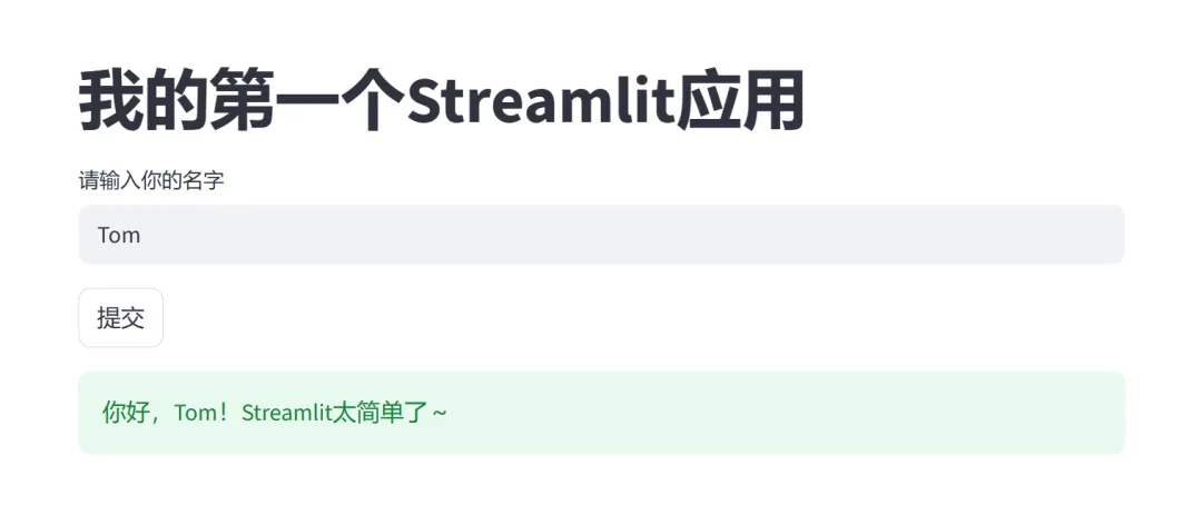 pip install streamlitimport streamlit as st# 设置标题st.title("我的第一个Streamlit应用")# 添加输入框name = st.text_input("请输入你的名字")# 交互逻辑if st.button("提交"):st.success(f"你好,{name}!Streamlit太简单了~")