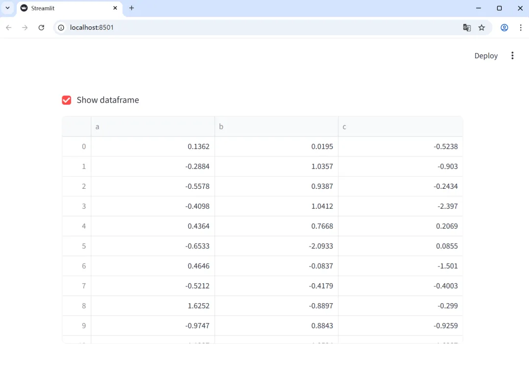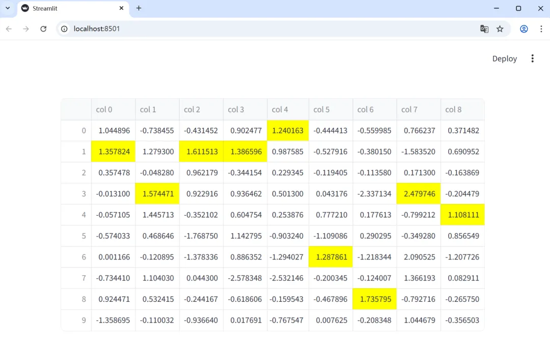 import streamlit as stimport numpy as npimport pandas as pddataframe = pd.DataFrame(np.random.randn(10, 20),columns=('col %d' % i for i inrange(20)))st.dataframe(dataframe.style.highlight_max(axis=0))