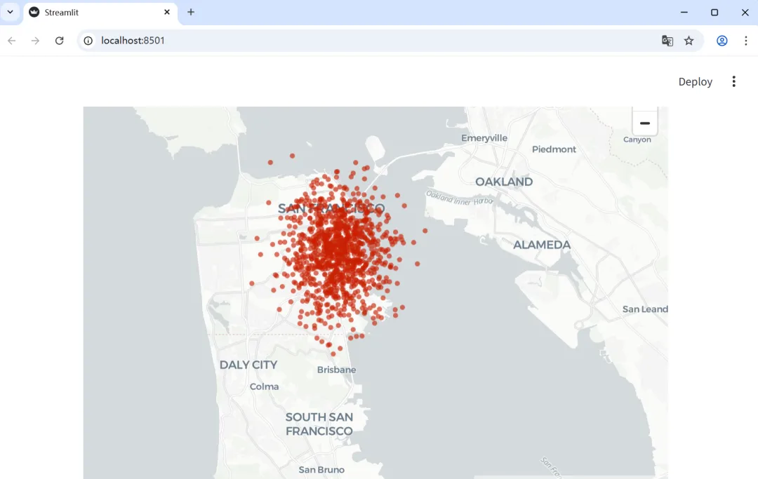 import streamlit as stimport numpy as npimport pandas as pdmap_data = pd.DataFrame(np.random.randn(1000, 2) / [50, 50] + [37.76, -122.4],columns=['lat', 'lon'])st.map(map_data)