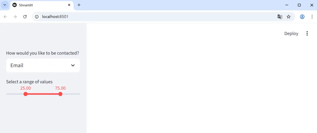 import streamlit as stadd_selectbox = st.sidebar.selectbox('How would you like to be contacted?',('Email', 'Home phone', 'Mobile phone'))add_slider = st.sidebar.slider('Select a range of values',0.0, 100.0, (25.0, 75.0))