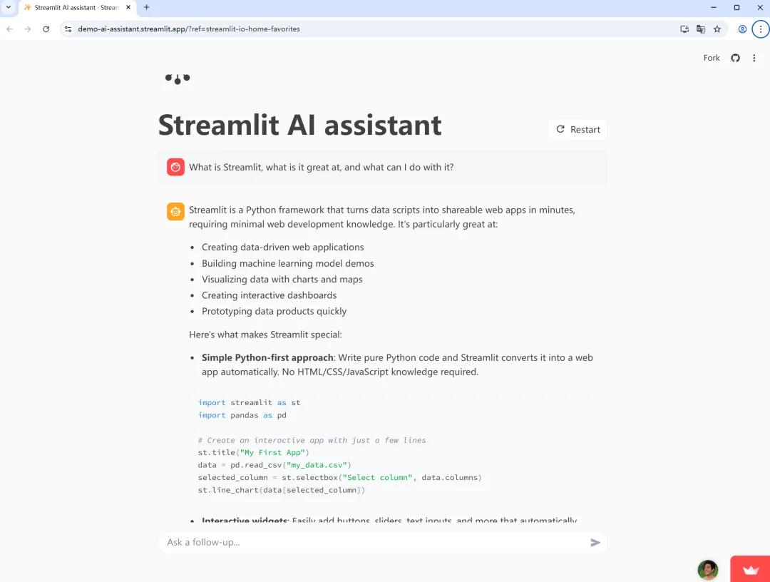 Streamlit 完美适配 Python 数据科学生态,无论是数据分析常用的 pandas、Matplotlib,还是机器学习领域的 TensorFlow、PyTorch,甚至是热门的 LLM 库,都能直接集成,无需额外适配。