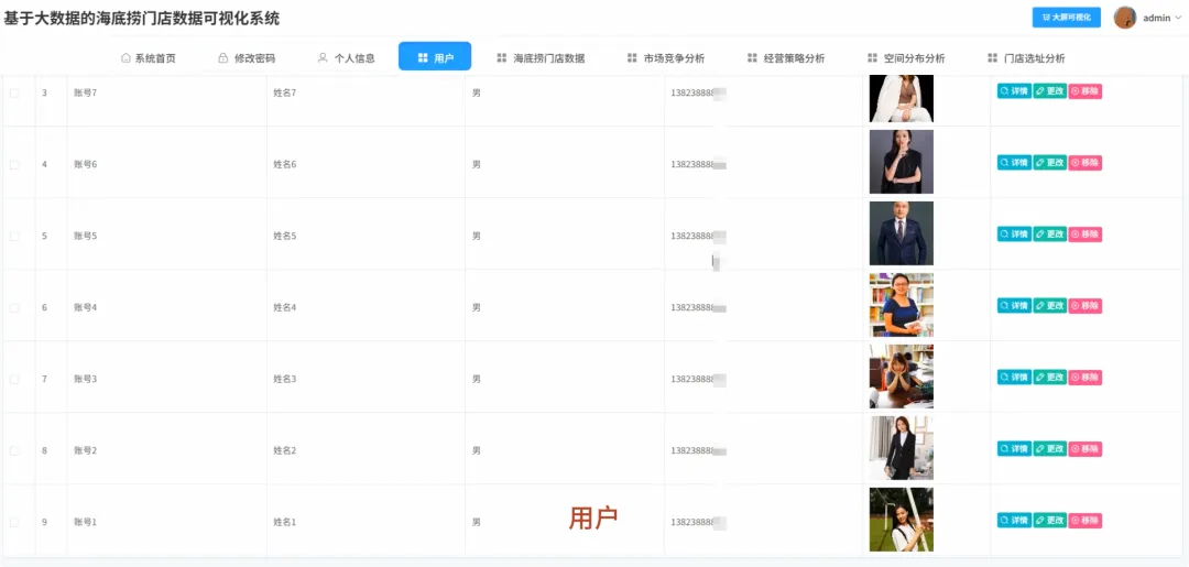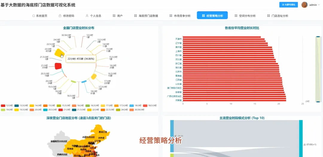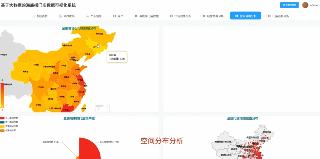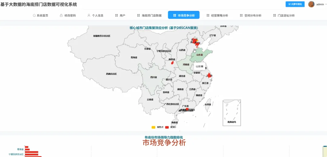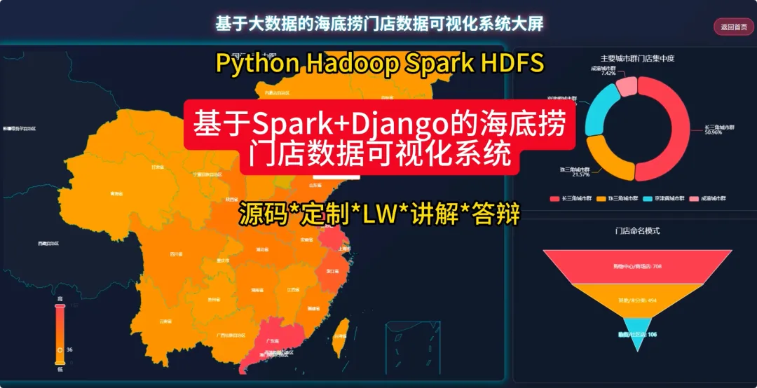# 核心功能代码汇总from pyspark.sql import SparkSessionfrom pyspark.sql.functions import col, count, when, litfrom pyspark.ml.feature import VectorAssemblerfrom pyspark.ml.clustering import DBSCANfrom pyspark.sql.types import StringType# 初始化SparkSessionspark = SparkSession.builder.appName("HaiDiLaoAnalysis").getOrCreate()# 假设df_spark是从HDFS或本地加载的门店数据DataFrame# df_spark = spark.read.csv("hdfs://path/to/haidilao_stores.csv", header=True, inferSchema=True)# 功能1: 全国各省份门店数量分布统计def analyze_store_distribution_by_province(df): # 按省份分组,计算每个省份的门店数量 province_counts = df.groupBy("province").agg(count("store_name").alias("store_count")) # 按门店数量降序排序 sorted_province_counts = province_counts.orderBy(col("store_count").desc()) # 转换为Python列表以供Django视图使用 result = sorted_province_counts.collect() # 模拟Django视图返回数据 return [{"province": row['province'], "count": row['store_count']} for row in result]# 功能2: 核心城市内门店集聚效应分析 (DBSCAN聚类算法)def analyze_clustering_with_dbscan(df, city_name): # 筛选指定城市的数据 city_df = df.filter(col("city") == city_name).select(col("latitude"), col("longitude")) # 将经纬度特征合并为一个向量 assembler = VectorAssembler(inputCols=["latitude", "longitude"], outputCol="features") city_df_with_features = assembler.transform(city_df) # 创建并配置DBSCAN模型 dbscan = DBSCAN(eps=0.01, minPts=2, featuresCol="features", predictionCol="cluster") # 训练模型并进行聚类 model = dbscan.fit(city_df_with_features) clustered_df = model.transform(city_df_with_features) # 提取坐标和聚类标签 result = clustered_df.select("latitude", "longitude", "cluster").collect() # 模拟Django视图返回数据 return [{"lat": row['latitude'], "lng": row['longitude'], "cluster": row['cluster']} for row in result]# 功能3: 门店命名与商业地产品牌关联度def analyze_mall_association(df): # 定义要查找的商业地产品牌关键词 keywords = ["万达", "万象城", "吾悦", "银泰", "大悦城", "龙湖"] # 使用when-otherwise链来标记门店关联的品牌 df_with_brand = df.withColumn("associated_brand", when(col("store_name").contains(keywords[0]), lit(keywords[0])) .when(col("store_name").contains(keywords[1]), lit(keywords[1])) .when(col("store_name").contains(keywords[2]), lit(keywords[2])) .when(col("store_name").contains(keywords[3]), lit(keywords[3])) .when(col("store_name").contains(keywords[4]), lit(keywords[4])) .when(col("store_name").contains(keywords[5]), lit(keywords[5])) .otherwise(lit("其他或无")) ) # 按关联品牌分组并计数 brand_counts = df_with_brand.groupBy("associated_brand").agg(count("store_name").alias("store_count")) # 只筛选出有关联品牌的记录 associated_brands_df = brand_counts.filter(col("associated_brand") != "其他或无") result = associated_brands_df.orderBy(col("store_count").desc()).collect() # 模拟Django视图返回数据 return [{"brand": row['associated_brand'], "count": row['store_count']} for row in result]