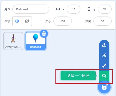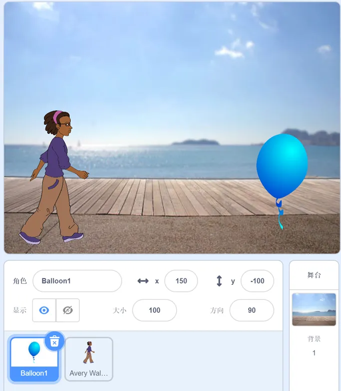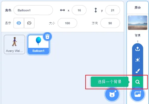 删除默认小猫角色,添加角色Balloon1和Avery Walking。