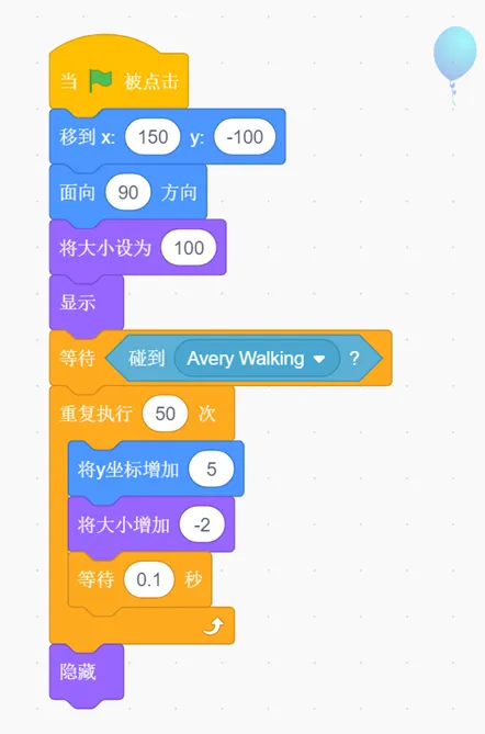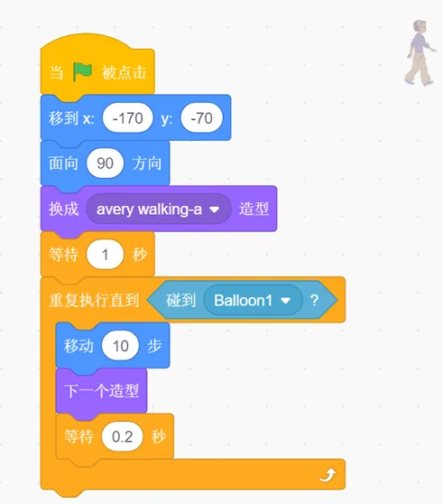 (4)等待1秒后,角色Avery Walking以每次移动10步,更换一次造型,等待0.2秒的速度向Balloon1前进,直到碰到Balloon1为止。