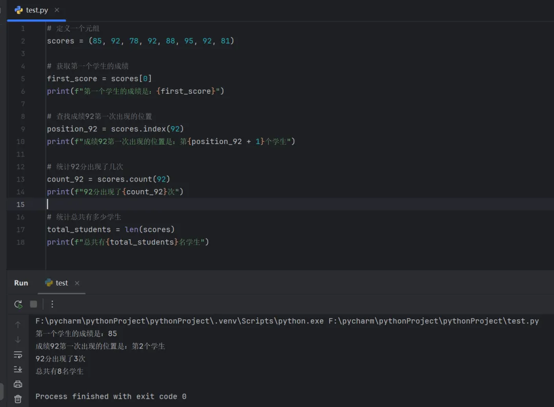 # 定义一个元组scores = (85, 92, 78, 92, 88, 95, 92, 81)# 获取第一个学生的成绩first_score = scores[0]print(f"第一个学生的成绩是:{first_score}") # 查找成绩92第一次出现的位置position_92 = scores.index(92)print(f"成绩92第一次出现的位置是:第{position_92 + 1}个学生") # 统计92分出现了几次count_92 = scores.count(92)print(f"92分出现了{count_92}次") # 统计总共有多少学生total_students = len(scores)print(f"总共有{total_students}名学生")