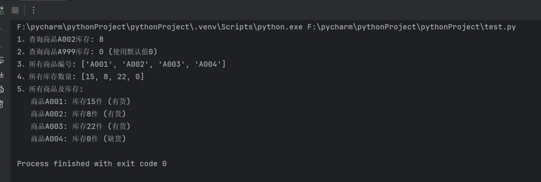 inventory = { "A001": 15, "A002": 8, "A003": 22, "A004": 0}# # 1、使用get(key, 默认值)方法查询获取商品A002的库存stock_002 = inventory.get("A002")print(f"1、查询商品A002库存: {stock_002}") # 输出: 8# 2、查询不存在的商品A999,设置默认值为0stock_999 = inventory.get("A999", 0)print(f"2、查询商品A999库存: {stock_999} (使用默认值0)") # 输出: 0# 3、使用keys()方法获取所有商品编号all_codes = inventory.keys()print(f"3、所有商品编号: {list(all_codes)}") # 输出: ['A001', 'A002', 'A003', 'A004']# 4、使用values()方法获取所有库存数量all_stocks = inventory.values()print(f"4、所有库存数量: {list(all_stocks)}") # 输出: [15, 8, 22, 0]# 5、使用items()方法获取所有商品编号和库存数量all_items = inventory.items()print(f"5、所有商品及库存:")for code, stock in all_items: status = "有货" if stock > 0 else "缺货" print(f" 商品{code}: 库存{stock}件 ({status})")