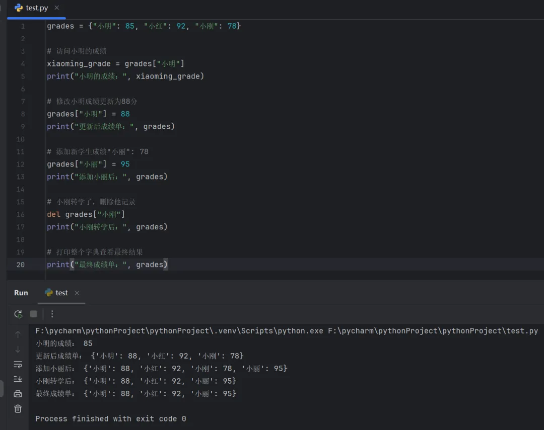 grades = {"小明": 85, "小红": 92, "小刚": 78}# 访问小明的成绩xiaoming_grade = grades["小明"]print("小明的成绩:", xiaoming_grade)# 修改小明成绩更新为88分grades["小明"] = 88print("更新后成绩单:", grades)# 添加新学生成绩"小丽": 78grades["小丽"] = 95print("添加小丽后:", grades)# 小刚转学了,删除他记录del grades["小刚"]print("小刚转学后:", grades)# 打印整个字典查看最终结果print("最终成绩单:", grades)
