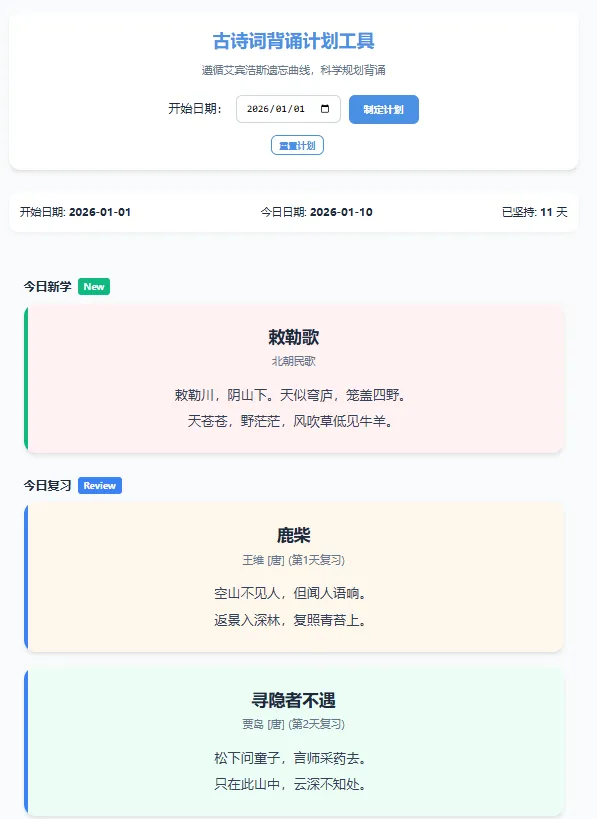 2.每天只显示当天要背诵的古诗词,并显示开始背诵的日期和当天的日期,同时要区分哪首是新背诵的,哪几首是复习的