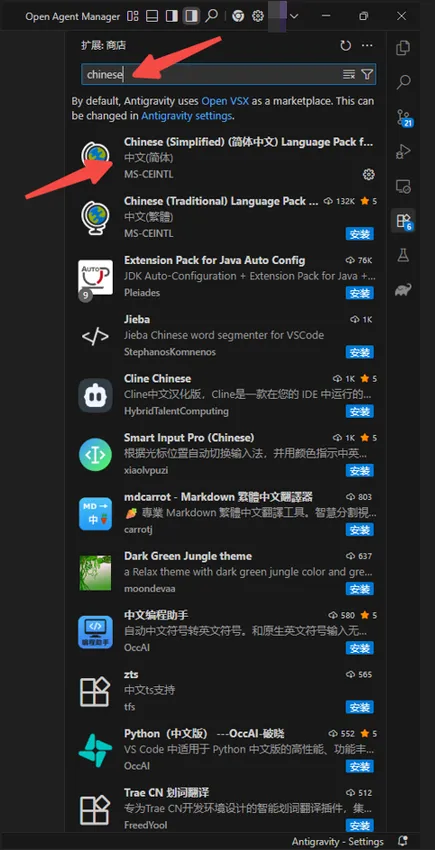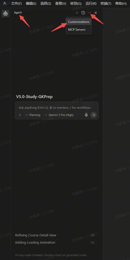 第二步:安装好插件后,重启ide,可以看到菜单栏变成了中文第一步:在agent栏中选择Customizations---