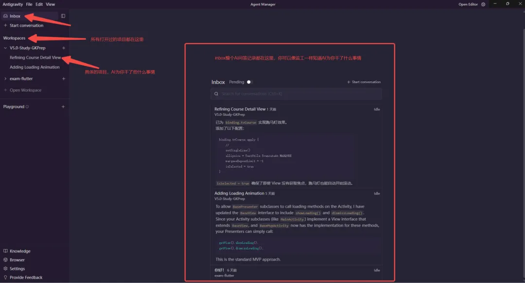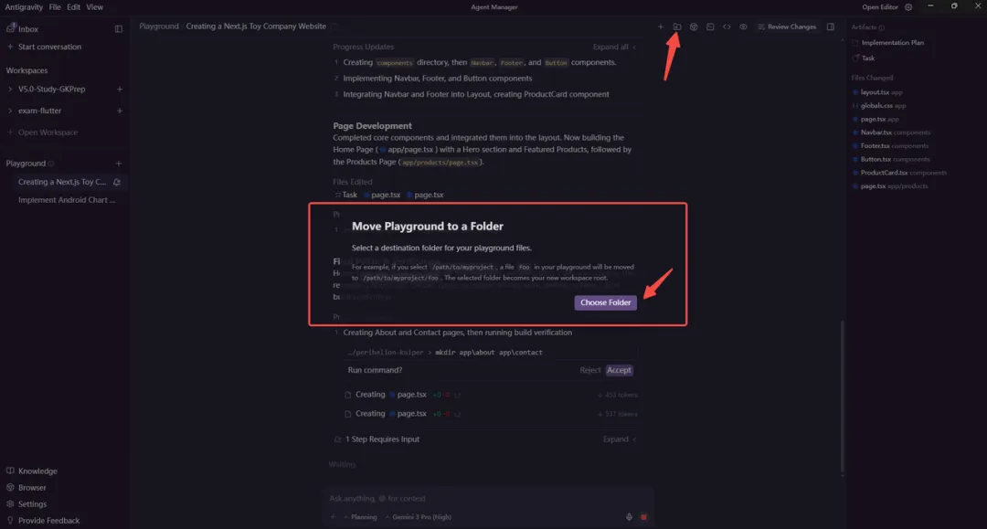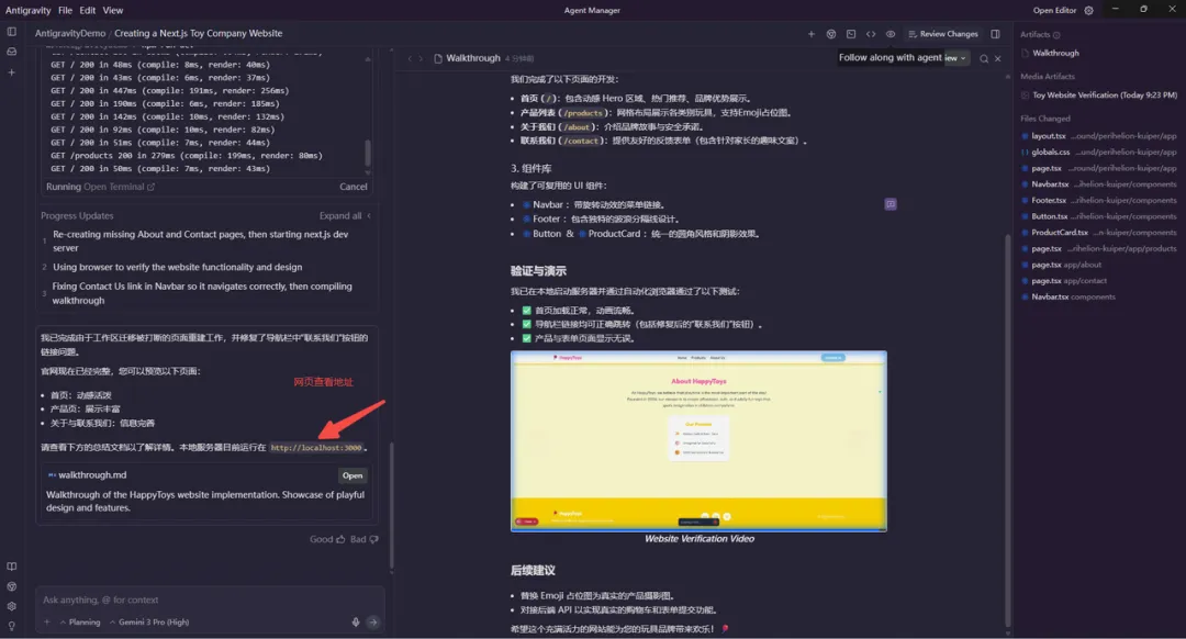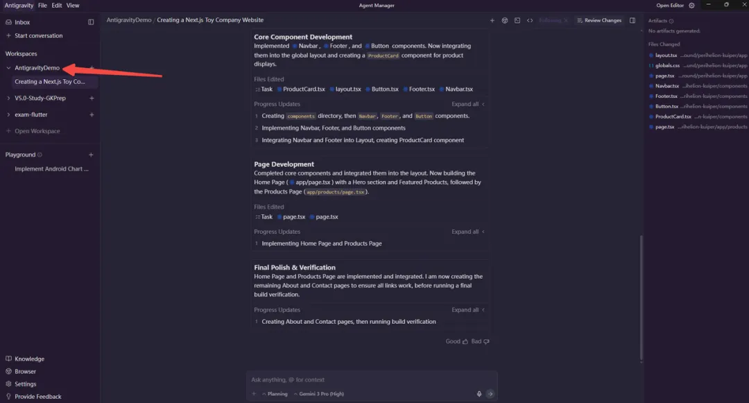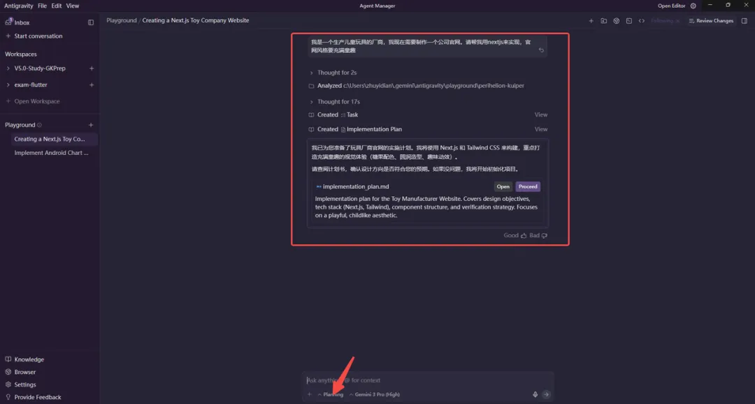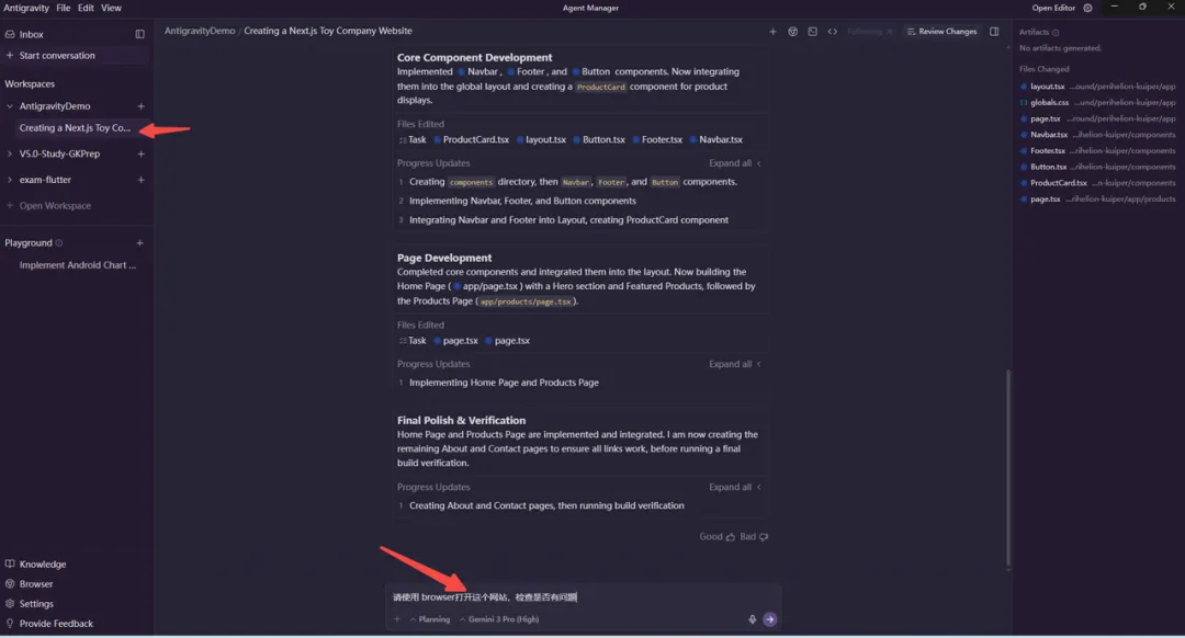 随时随地开启创意,确认创意 OK可以转到工作区进行进一步的优化不选中任何工作区的情况下,把你的新创意在这里进行实现。我们已经让ai生成了项目,注:这个项目是AI直接给我们新创建的。目前这个项目没有工作区,所以我们要将这个项目先迁移到一个工作区中首次使用 Antigravity 浏览器代理时,会被引导至 Chrome 网上应用商店安装扩展程序。点击 Playback 可以查看 Browser Agent 的回放我们将“工件”定义为代理为了完成工作或将其工作和思考过程传达给用户而创建的任何内容。这些内容包括丰富的 Markdown 文件、差异视图、架构图、图像、浏览器录制、代码差异等等。随着代理变得越来越自主,运行时间也越来越长,“工件”使得代理能够异步地将其工作传达给用户,而无需用户同步地仔细监控代理的每个步骤。知识条目是 Antigravity 的持久记忆系统,它能自动捕获并整理您编码过程中重要的见解、模式和解决方案。它们能帮助您在后续的对话中,基于先前的工作不断深入。当与代理互动时,Antigravity 会自动分析并从对话中提取信息,并使用这些信息来创建新的知识 或更新现有的知识。九、NanoBanaPro🍌: 你的 UI 设计师可以让AI调用nanobana pro大模型进行Ui设计可以看到确实设计了logo,但是没有使用nanobana pro大模型进行生成,有待研究。第二步:开始执行,切记一定要选择planning模式,因为我们是从0开始实现一个项目第三步:查看项目执行的详细内容 follow, artifacts第五步:这里可以看到需要创建项目目录了,我们继续选择执行,让AI帮我们自动创建第七步:导入工作区后,可以看到我们的这个项目已经在工作区中了第八步:接下来我们可以用到浏览器自动化测试,也即自带的Brosie agent,去浏览网页看下有什么问题网站地址:http://localhost:3000/