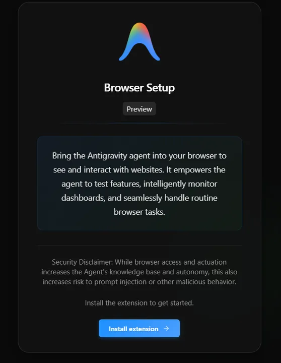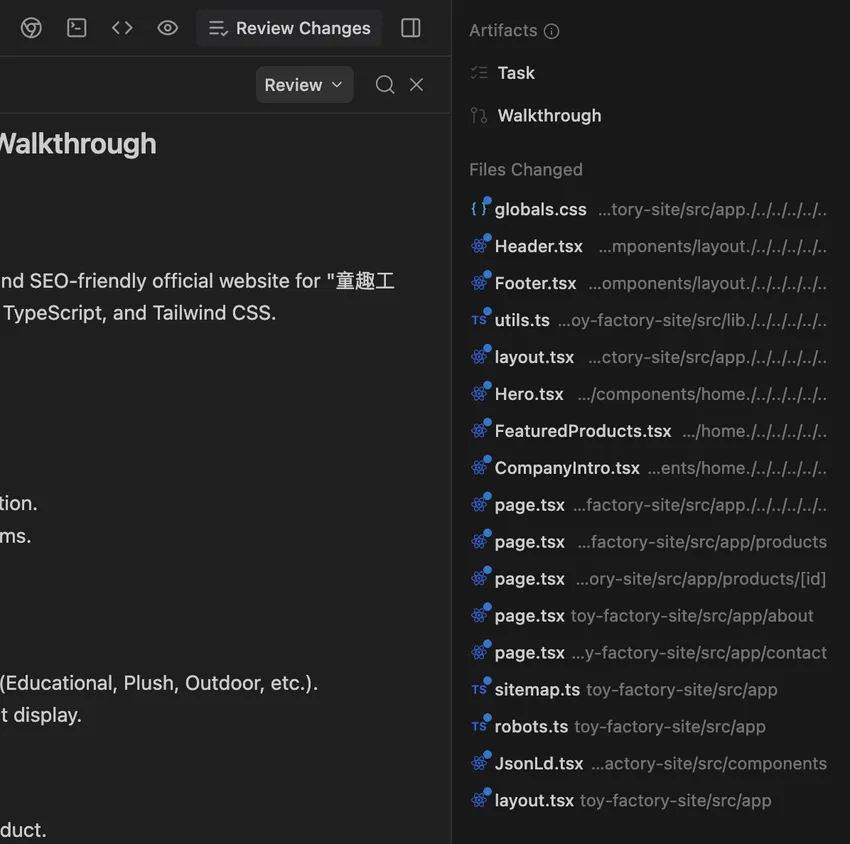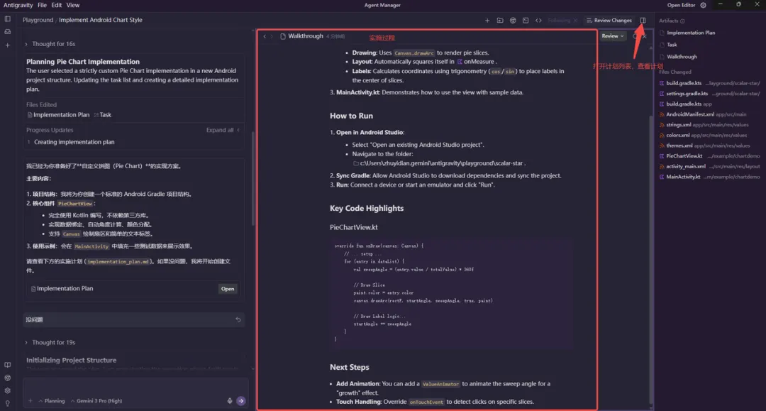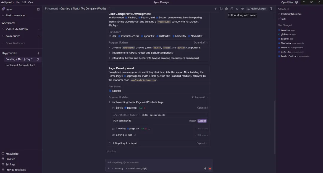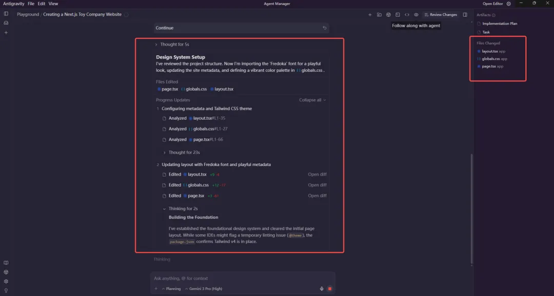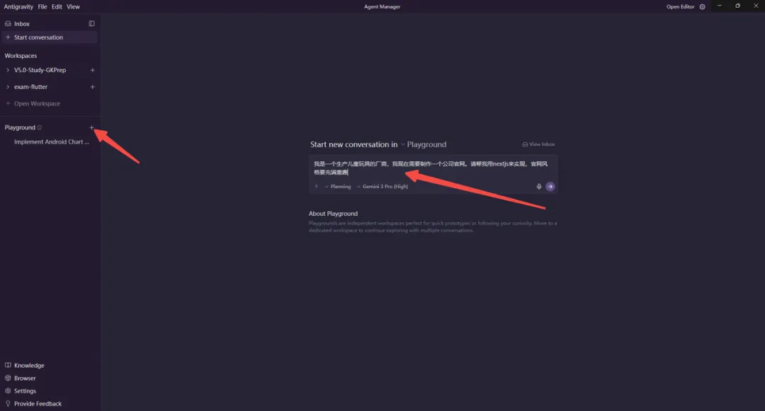 随时随地开启创意,确认创意 OK可以转到工作区进行进一步的优化不选中任何工作区的情况下,把你的新创意在这里进行实现。我们已经让ai生成了项目,注:这个项目是AI直接给我们新创建的。目前这个项目没有工作区,所以我们要将这个项目先迁移到一个工作区中首次使用 Antigravity 浏览器代理时,会被引导至 Chrome 网上应用商店安装扩展程序。点击 Playback 可以查看 Browser Agent 的回放我们将“工件”定义为代理为了完成工作或将其工作和思考过程传达给用户而创建的任何内容。这些内容包括丰富的 Markdown 文件、差异视图、架构图、图像、浏览器录制、代码差异等等。随着代理变得越来越自主,运行时间也越来越长,“工件”使得代理能够异步地将其工作传达给用户,而无需用户同步地仔细监控代理的每个步骤。知识条目是 Antigravity 的持久记忆系统,它能自动捕获并整理您编码过程中重要的见解、模式和解决方案。它们能帮助您在后续的对话中,基于先前的工作不断深入。当与代理互动时,Antigravity 会自动分析并从对话中提取信息,并使用这些信息来创建新的知识 或更新现有的知识。九、NanoBanaPro🍌: 你的 UI 设计师可以让AI调用nanobana pro大模型进行Ui设计可以看到确实设计了logo,但是没有使用nanobana pro大模型进行生成,有待研究。第二步:开始执行,切记一定要选择planning模式,因为我们是从0开始实现一个项目第三步:查看项目执行的详细内容 follow, artifacts第五步:这里可以看到需要创建项目目录了,我们继续选择执行,让AI帮我们自动创建第七步:导入工作区后,可以看到我们的这个项目已经在工作区中了第八步:接下来我们可以用到浏览器自动化测试,也即自带的Brosie agent,去浏览网页看下有什么问题网站地址:http://localhost:3000/