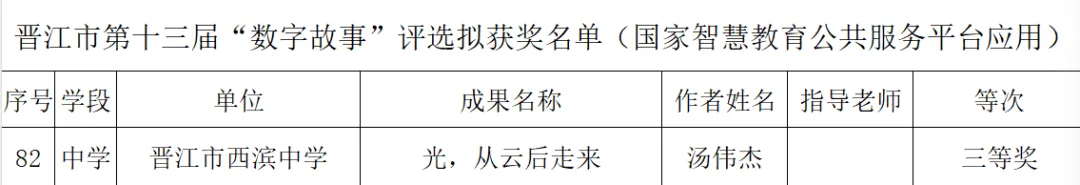 近日,晋江市第十三届“数字故事”评选中,我校汤伟杰老师作品荣获三等奖。
