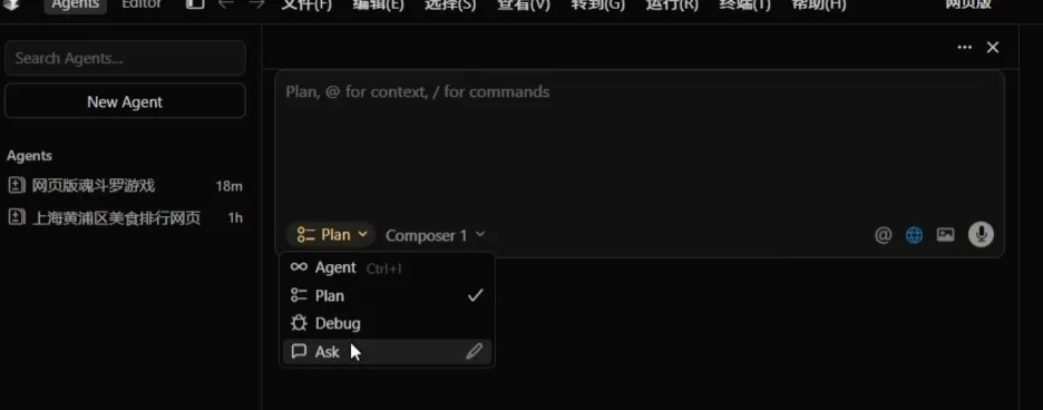 Agent 模式:只需要输入你的想法,就会自动开始执行,适合小白用户。