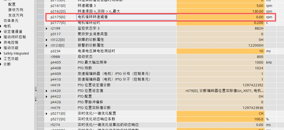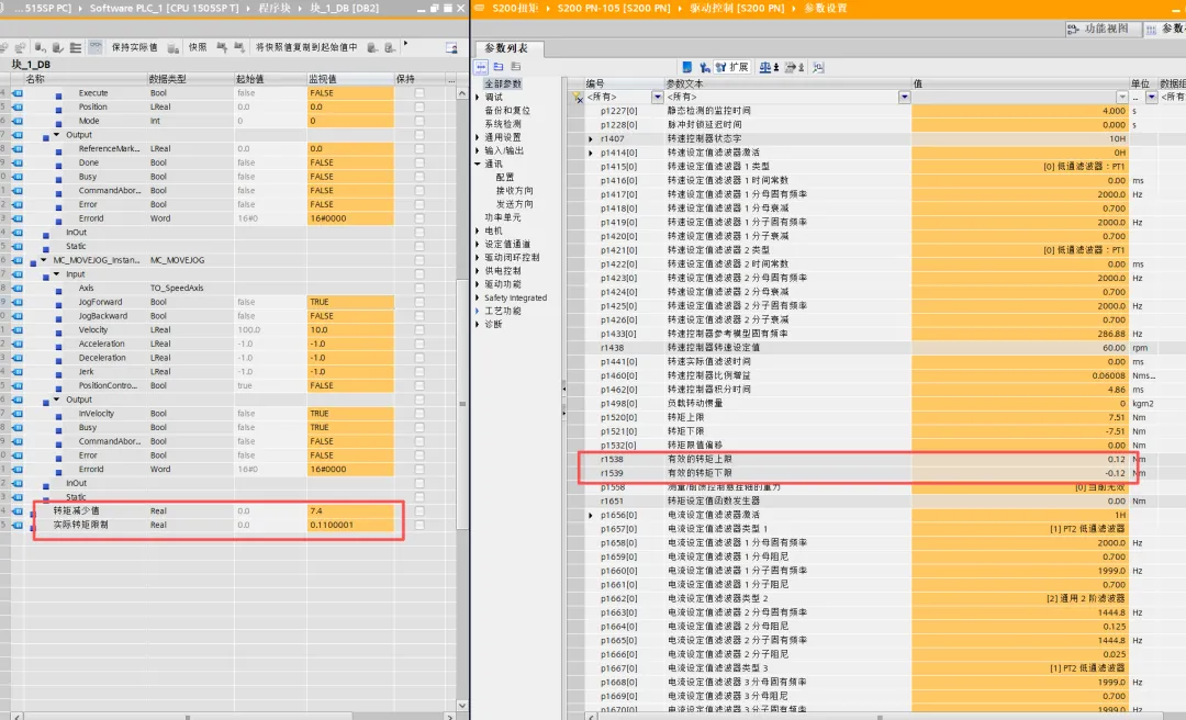 在 PLC 的 DB 块中,我们设置 “转矩减少值 = 7.4”,则:实际转矩限制 = 7.51 - 7.4 = 0.11Nm同时 S200 驱动器的 **r1532(有效转矩上限)** 也同步显示为 0.11Nm,说明限幅参数已生效。