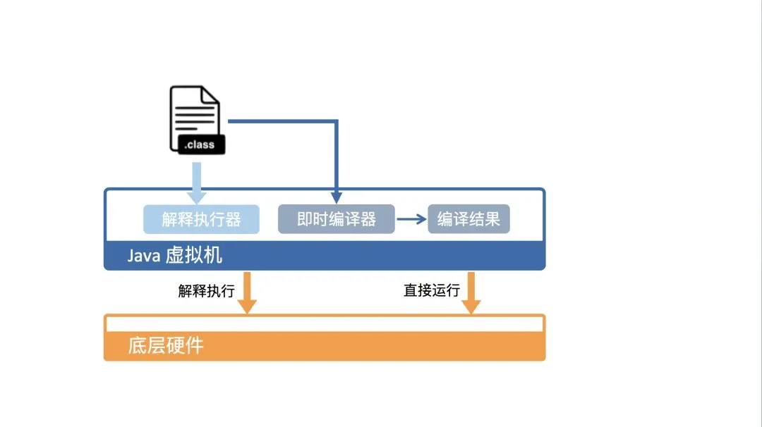 为了提高运行效率,标准 JDK 中的 HotSpot 虚拟机采用的是一种混合执行的策略。首先,它会解释执行 Java 字节码,然后会将其中反复执行的热点代码,以方法为单位进行即时编译,翻译成机器码后直接运行在底层硬件之上。HotSpot 装载了多个不同的即时编译器,以便在编译时间和生成代码的执行效率之间做取舍。