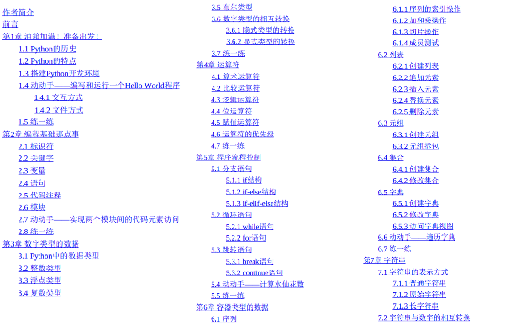 第2~5章介绍Python的基础知识,包括数据类型、表达式、流程 控制等。