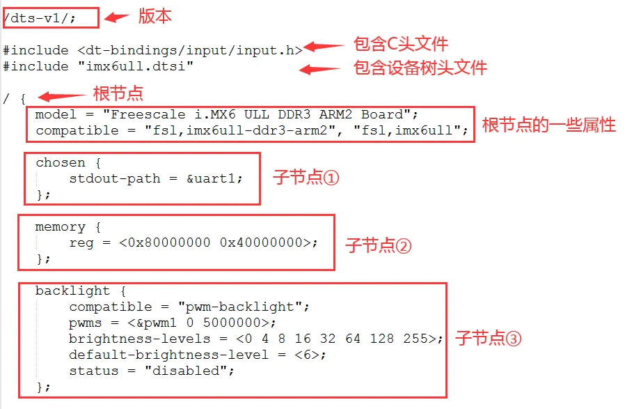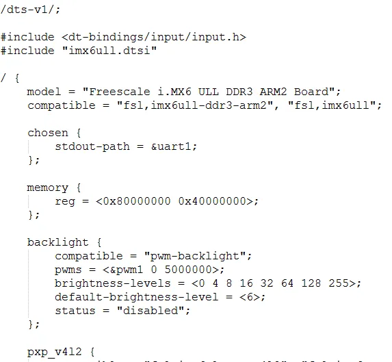设备树源文件也是需要根据一定规则来编写的,同C语言一样,也要遵循一些语法规则。下面简单看一下设备树的源码结构及语法。
