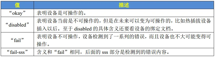 status 属性看名字就知道是和设备状态有关的, status 属性值也是字符串,字符串是设备的状态信息,可选的状态如下所示: