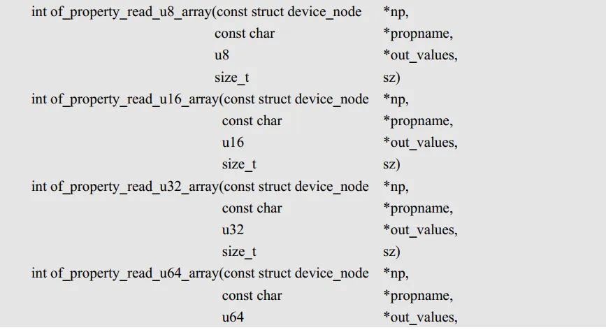 property *of_find_property(conststruct device_node *np,constchar *name,int *lenp);of_property_count_elems_of_size 函数用于获取属性中元素的数量,比如 reg 属性值是一个数组,那么使用此函数可以获取到这个数组的大小,此函数原型如下: