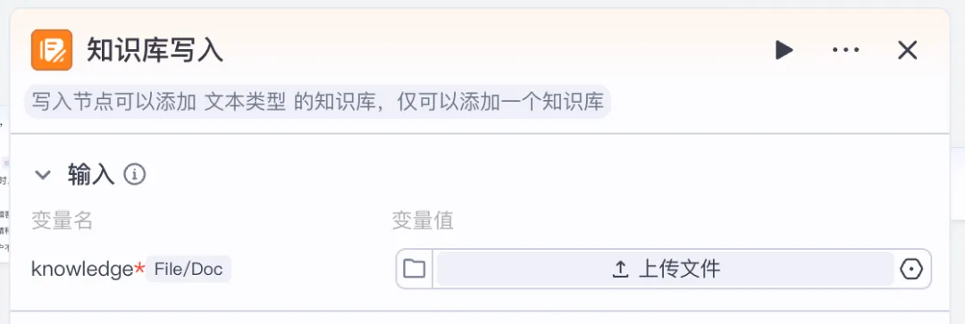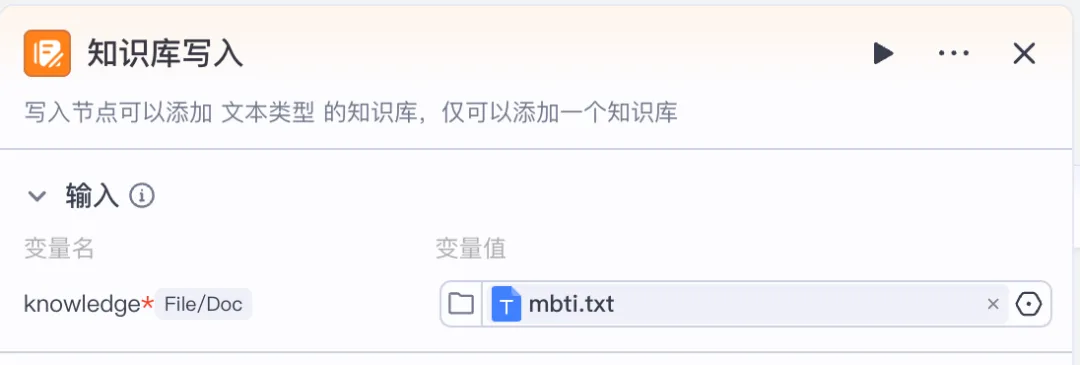 点 “知识库写入” 节点右侧面板的 “输入” 栏,点击 “上传文件” 按钮,选择本地的mbti.txt(仅支持文本类文件),确认上传后,变量值会显示文件名(比如mbti.txt)。