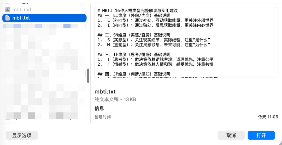 在扣子工作流里,想把本地文本文件(比如 MBTI 解析文档)导入知识库不用写代码。用 “知识库写入” 节点就能可视化完成,以导入mbti.txt到扣子知识库为例。