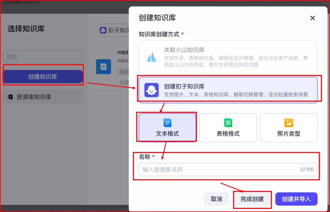 若没有知识库,点 “创建知识库”→选择 “创建扣子知识库”→选 “文本格式”→输入知识库名称(比如 “mbti”)→点 “完成创建”,再返回选择界面添加新创建的知识库。
