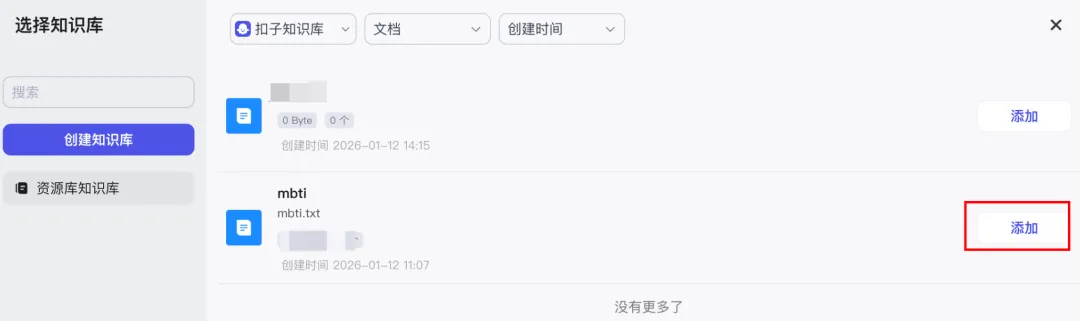 若已有目标知识库(比如名为 “mbti” 的扣子知识库),直接点右侧 “添加” 按钮关联;