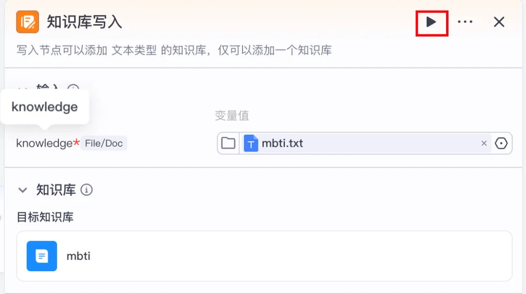 点 “知识库写入” 节点右上角的 “运行” 按钮,等待节点执行完成。此时mbti.txt就会被导入到关联的扣子知识库中,后续可以通过 “知识库检索” 节点调用这些内容。