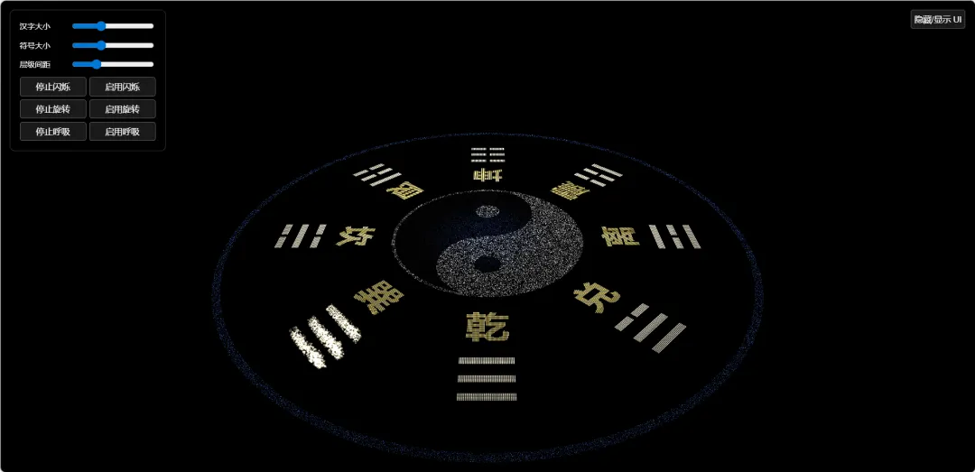 这是一个以太极与八卦为主题的动态视觉展示页面。画面由大量粒子构成,中间是太极结构,外圈分布八卦文字与符号,最外层为环形粒子边界。整体会缓慢旋转并呈现轻微的起伏与闪烁变化,鼠标靠近时局部会产生扰动。页面提供简单的参数调节,用于观看与体验不同的视觉效果。