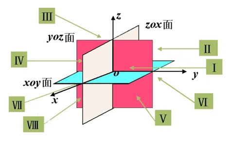 空间任意选定一点O,过点O作三条互相垂直的数轴Ox,Oy,0z,它们都以O为原点且具有相同的长度单位。这三条轴分别称作x轴(横轴),y轴(纵轴),z轴(竖轴),统称为坐标轴。它们的正方向符合右手规则,即以右手握住z轴,当右手的四个手指x轴的正向以π/2角度转向y轴正向时,大拇指的指向就是z轴的正向。这样就构成了一个空间直角坐标系,称为空间直角坐标系O-xyz。定点O称为该坐标系的原点。与之相对应的是左手空间直角坐标系。一般在数学中更常用右手空间直角坐标系,在其他学科方面因应用方便而异。任意两条坐标轴确定一个平面,这样可确定三个互相垂直的平面,统称为坐标面。其中x轴与y轴所确定的坐标面称为xOy面,类似地有yOz面和zOx面。三个坐标面把空间分成八个部分,每一部分称为一个卦限。如图<<卦限示意图>>所示,八个卦限分别用字母I、Ⅱ、Ⅲ、...Ⅷ表示,其中含x轴、y轴和z轴正半轴的是第I卦限,在xOy面上的其他三个卦限按逆时针方向排定,依次为第I、Ⅱ、Ⅲ、IV卦限;在xOy面下方与第I卦限相邻的为第V卦限,然后也按逆时针方向排定依次为第VI、Ⅶ、Ⅷ卦限。6:极坐标系
