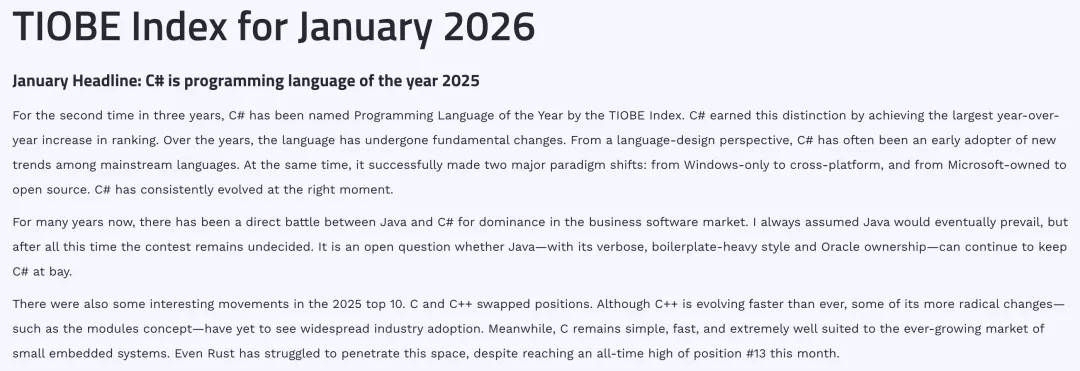 TIOBE 公布的数据显示,C# 以 2.94% 的年度最大涨幅再度获评2025 年度编程语言,这是 C# 在三年内第二次获此殊荣,凭借的是其在榜单上最大的年度增长幅度。其实,C# 早就不是当年那个贴着“Windows 独占”和“闭源”标签的语言了。从早期的模仿者到如今现代语言特性的引领者,C# 成功完成了向跨平台和开源的巨大转型。