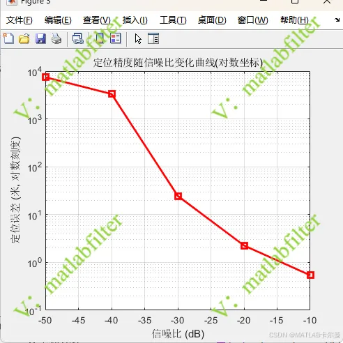 SNR与定位精度的关系曲线(对数显示):