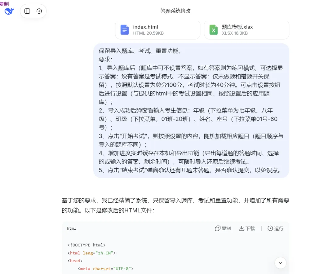 4、增加进度实时缓存在本机和导出功能(导出每道题的答题时间、选择的或输入的答案、剩余时间),可随时导入还原后继续考试。