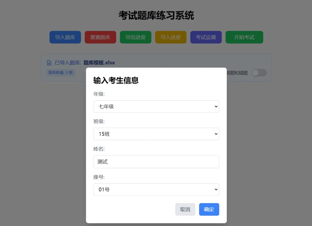 2、导入成功后弹窗看输入考生信息:年级(下拉菜单为七年级、八年级)、班级(下拉菜单,01班-20班)、姓名、座号(下拉菜单01号-60号);