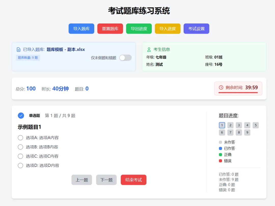 1、导入题库后(题库中可不设置答案,如有答案则为练习模式,可选择显示答案;没有答案是考试模式,不显示答案;仅未做题和错题开关保留),按照默认设置为总分100分,考试时长为40分钟。可点击设置按钮后进行设置(与提供的html中的考试设置相同,按照设置后的应用题库);