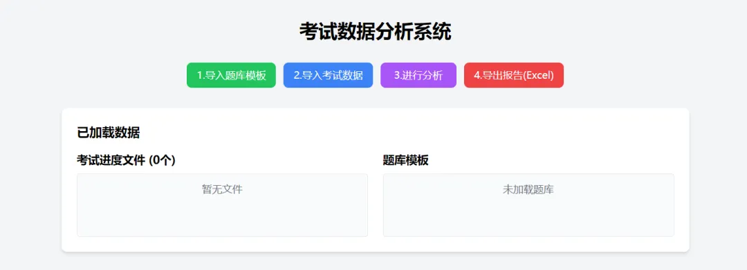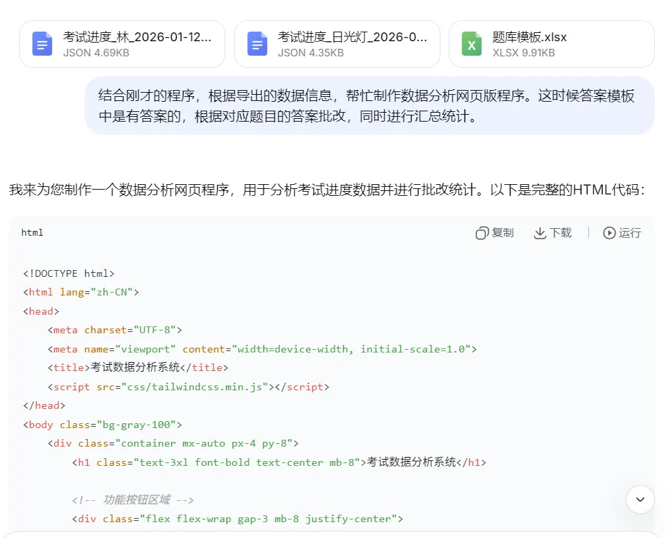 结合刚才的程序,根据导出的数据信息,帮忙制作数据分析网页版程序。这时候答案模板中是有答案的,根据对应题目的答案批改,同时进行汇总统计。