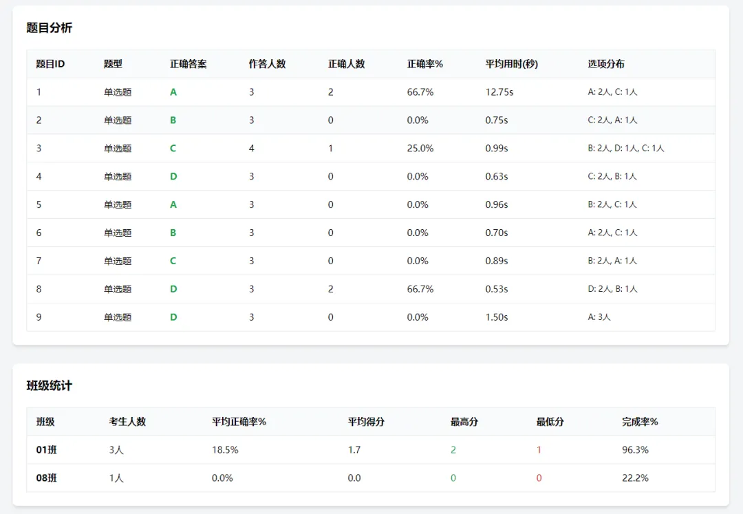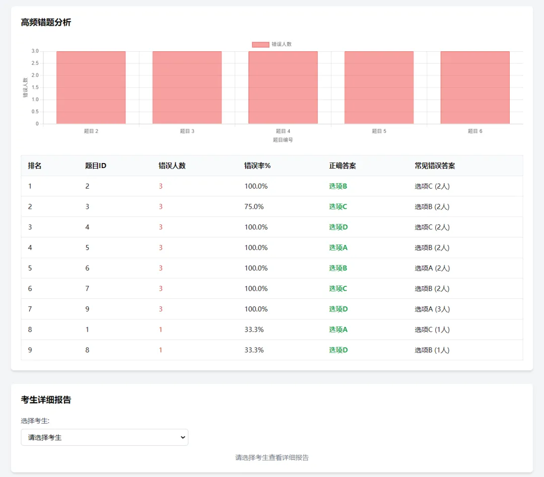 教师端:能够时间加载题库和学生答题结果,进行分析。