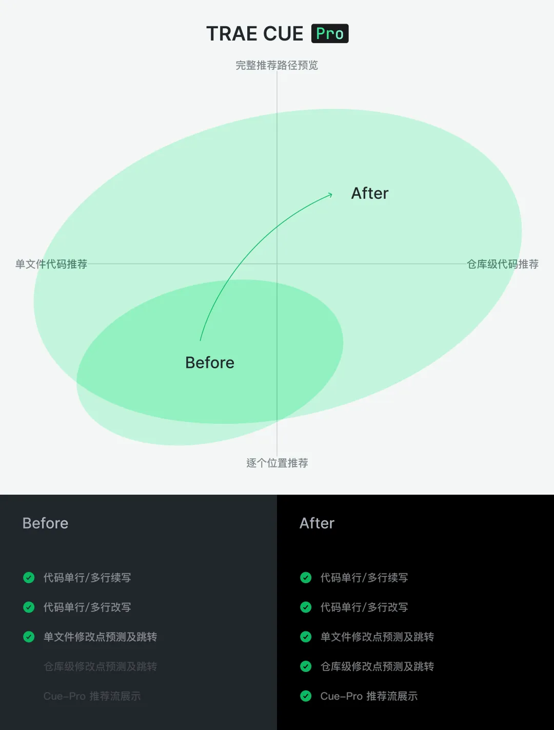 TRAE Cue 能即时捕捉你编辑器里的每一个动作和意图,并根据这些即时编辑推荐,而 Cue-Pro 模式能够在深度推理用户的编辑意图,提供恰到好处、高度相关并且更完整的代码建议或自动化操作。传统的代码补全,可能只是基于你输入的前几个字符或当前文件的静态分析,给出光标后续或者光标周围小片段代码的编辑推荐。但 TRAE 的 Cue-Pro 能感知到你「正在做什么」,所以它能给出符合用户编辑意图的多个编辑建议,相比传统方式做到更完整编辑点位的识别。